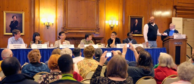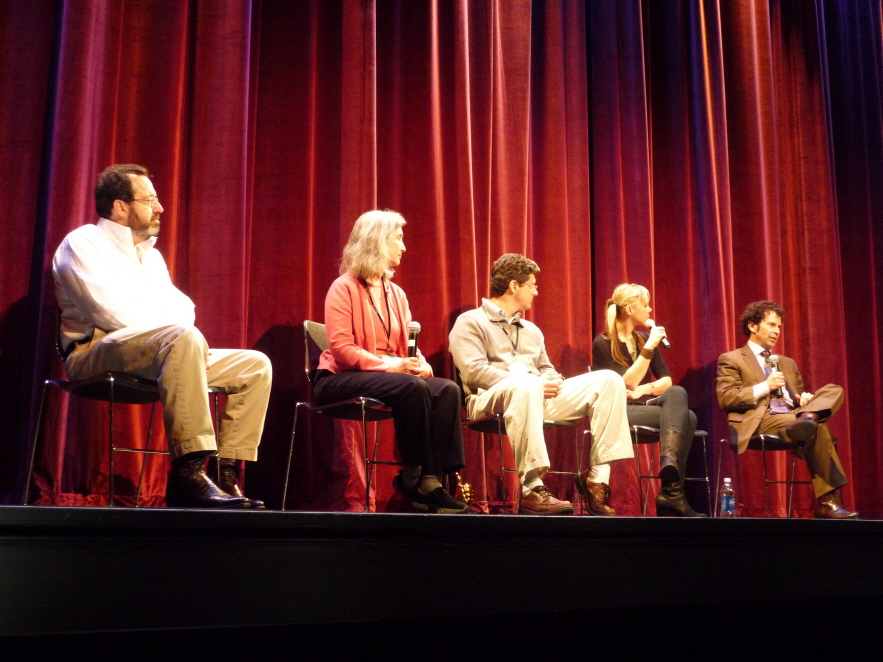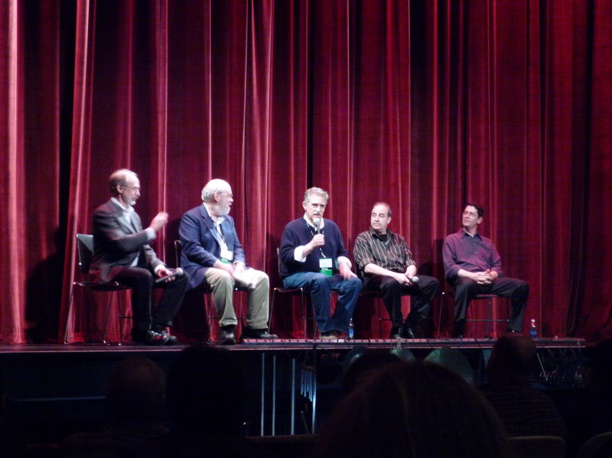 (From the Left) Unidentified Panelist, Bordwell, Howie Movshovits, and two members and The Alloy Orchestra