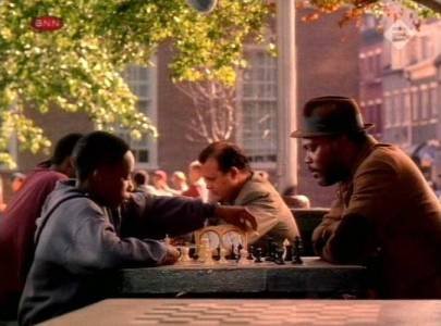 Sam spends most of his days in the park while earning the money for his beer with speed chess. He is an intelligent man, and he has taught his son speed chess while also giving him some life lessons through his teaching. In that crucial scene mentioned above, while playing chess with his son as usual, he imparts a lesson to him; “You’re playing each piece like losing it hurts. They ain’t checkers. You want my king. You got to come get my king. All these other pieces are just the means to do it.” (A small trivia: Bruce Pandolfini, who is mentioned by Sam along with several famous chess players, was a technical advisor in this film. He was played by Ben Kingsley in “Searching for Bobby Fisher”(1993), another movie about a smart kid good at chess play).