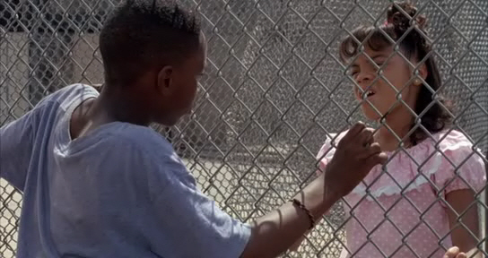 At school, he has several friends at his age he can hang around with. His best friend is Chuckie(Luis Lantigua), whose careless loquaciousness contrasts with Fresh’s reticence. One day, Fresh notices one of the schoolgirls, and she notices him, too. Their interaction with a wire fence between them is one of few small warm moments in the story.