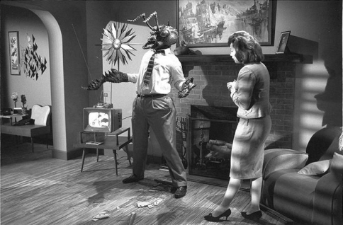 I do not think his tactics, as gimmicky as 3-D, enhanced his movies much(I personally think the best thing he did in his career was letting Roman Polanski direct “Rosemary’s Baby”(1968) instead of directing it for himself), but he certainly gave something to be remembered with smile, and that is endearingly reflected in Dante’s film. Before the premiere showing, Woolsey’s girlfriend, wearing nurse uniform, demands the audiences to sign the medical consent form in case they die while watching the movie, the electronic buzzers are wired to the seats for giving a jolt to the audiences, the smoke is fumed from time to time in front of the screen, the theater gets trembled thanks to “Rumble-Rama”, and a guy hired by Woolsey wearing a big rubber suit(guess what does it look like?) walks around the aisle to ‘scare’ the audiences.