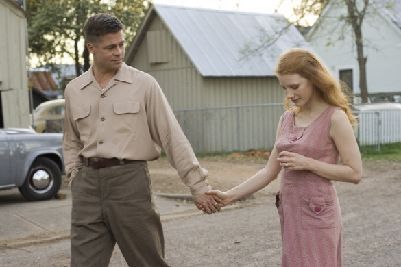 As the narration implies, Jack’s parents are contrasting figures in his life as ‘nature’ and ‘grace’. His father(Brad Pitt) is a stern guy who can be a nice father but also can be a harsh man to his three sons. He tries to teach them about the world outside unfair to him, but that only makes him no more than a tyrant in their eyes. In contrast, his mother(Jessica Chastain) is a kind and generous woman who express the love to her boys more openly. In the religious viewpoint of the movie, their contrast is naturally connected with the contradicting image of Christian God, who gives life with grace and then takes them away according to the merciless law of the nature he makes. Pitt is good as a plain flawed man with an unfulfilled dream who loves his sons in a rather misguiding way. Chastain is radiant as a gentle soul who embraces them without condition.