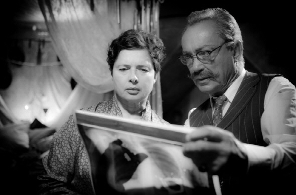 Even though I did not understand much of the movie, I enjoyed how it looks. The movie is shot with the digital camera, and it is quite faithful to the looks and feelings of those old silent black and white film(it is more faithful than “The Artist”(2011)). The cinematographer Benjamin Kasulke gives us the spooky show of lights and shadows on the screen, and the faces of actors are effectively utilized in this dreamy background. As the other audiences said after the movie was over, Jason Patrick looks dashing, and Isabella Rossellini is both compelling and elusive as the wife who does not much care about her husband, and Udo Kier gives a surprisingly normal performance as the doctor visiting them, even with the X-ray photography showing the cancer which looks like a handcuff.