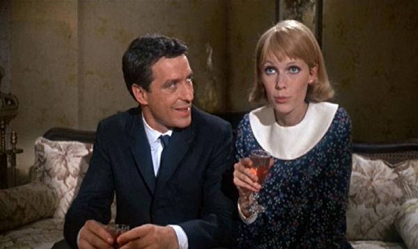 After the main title sequence in which the camera slowly looks around the skyline of New York and then looks down on one gothic apartment building located in the Upper West Side area of Manhattan, we see a young married couple entering the building with their real estate agent(Elisha Cook Jr. – you probably remember him as one of the supporting characters in “The Maltese Falcon”(1941)). Rosemary Woodhouse(Mia Farrow) and her husband Guy(John Cassavetes) come to look around an apartment luckily available to them due to the recent death of its previous tenant. Guy is reluctant because of a little too expensive rent, but Rosemary loves the apartment, so they decide to move into that place. Although Rosemary’s close friend Hutch(Maurice Evans – he was Dr. Zauis in “Planet of the Apes”(1968)) tells them about the unpleasant history surrounding the building, but they do not mind about that much. After all, they are not moving into a haunted house in remote place, and they are not alone in the building located in the middle of New York, are they?