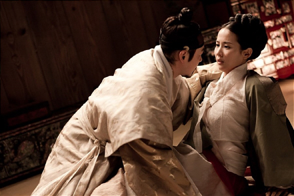 Unlike the recent South Korean period dramas, the movie has a notable anachronistic feeling. It seems its background is the Joseon dynasty(1392-1910) considering the design of architectures in the film, but there is also the influences from the Goryeo dynasty(918-1392) in the characters’ costumes and other details. They behave like the people living during the Joseon dynasty, but, as far as I know, there was not any incident during that period which can possibly inspire the lurid story of the film, and I have never heard about the king’s mother presiding over the copulation ritual of her son and daughter-in-law in the next room.