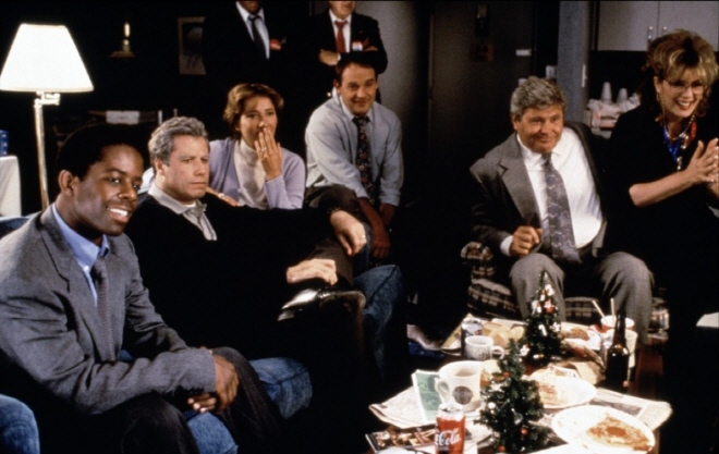That is how the Stantons’ longtime colleague Libby Holden (Kathy Bates) comes into this busy picture as a fixer, or a “dust buster” as she calls herself. As a brash, zealous, and unstable woman ready to do anything for her close friends, Bates gives a juicy comic performance through the role she is destined to play. In one memorable scene, she storms into a sleazy lawyer’s office, and it is clear to everyone in the office that Libby is the unstoppable force of nature who will not go away unless she gets what she needs for fixing Stanton’s latest problem. (Klein actually had Bates in his mind when he created that character, although many people thought Libby was based on Betsey Wright.)