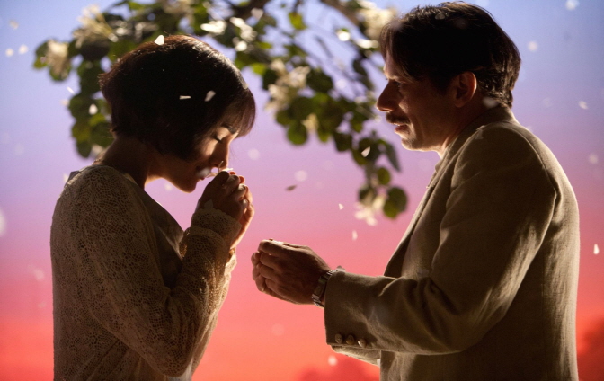It is turned out that his heart already went toward a young, beautiful woman named Irâne(lovely Golshifteh Farahani). He was fallen in love with her when she passed by him, and, not long after he officially introduced himself to her, their romance was quickly blossomed in front of purple/pink sky with white flowers slowly falling from a tree in the wind. They were really in love, but they faced the reality because of Irâne’s father, who would not allow a nameless artist to marry his precious daughter. The heartbreak followed, and, while we get a classic example of how an artist is sometimes inspired by a broken heart rather than a fulfilled one, we come to learn more about Nasser-Ali’s choice to kill himself through one heartbreaking sequence which wordlessly shows the passage of the time and accompanying bitter sadness.