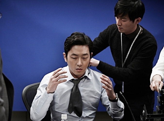 The movie firmly sticks to its limited space for accumulating the suspense on the screen. The urgent circumstance outside the building is mainly shown through the TV monitors in the studio, and the movie generates several devastating moments even though we only observe them indirectly through the TV cameras. There are also several supporting characters in the studio telling Yeong-hwa what is going on and off the screen, and they give him both hope and desperation as he is kept pushed by them as well as the bomber. His boss only cares about higher viewing rating(he even orders Yeong-hwa to provoke the bomber to kill the hostages for the advantage of his company and the government), and the government officials see him as someone expendable while more focusing on saving their positions in this emergency, and it is not so surprising that Yeong-hwa comes to see himself trapped in more than one way as the time goes by.