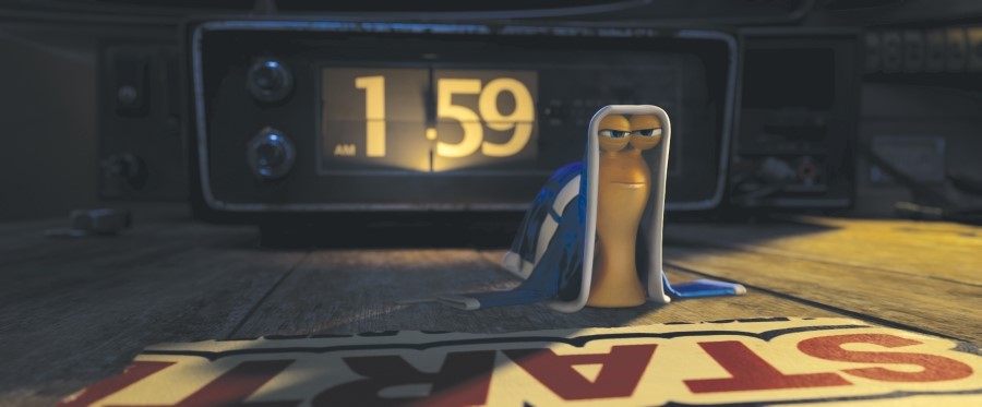 Of course, Theo’s practical brother Chet(voiced by Paul Giamatti distinctively channeling his nerdy persona) thinks Theo wastes his time on the dream he will never fulfil, and he always tells his brother that he should concentrate more on their daily work at ‘the plant’. They and other snails spend most of their waking hours on harvesting the tomatoes in the garden, and all they have to do is just waiting on the stalks for the tomatoes to be ripened and then to be fallen to the ground. Although they do not have hands, they have an inventive way of slicing their harvested tomatoes before their meal time, and they also can make clapping sounds with their two eyes as shown during their routine meeting. That is nice, but I’d love to see how Theo can operate his personal TV and VHS player – how can he move the cassettes and insert them into the player, I wonder?
