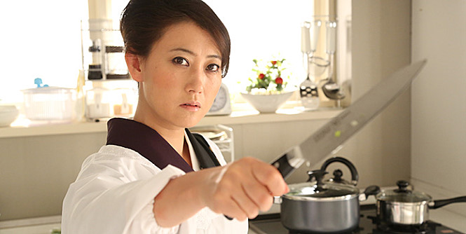 Meanwhile, there is a big clash between two yakuza organizations in the neighborhood, and that results in a bloody incident involved with the wife of Muto(Jun Kunimura), the leader of one of these two gang organizations. Five rival gang members break into his house to kill him, but they only find his wife in the house, and everyone except one guy is brutally murdered by this feisty woman who happens to be working at the kitchen at that time. It turns out that a young girl in that toothpaste commercial is Muto’s daughter, so we get a viciously humorous moment when this cute little girl cheerfully arrives at her home and then gracefully glides on one hell of bloodbath left by her mom.