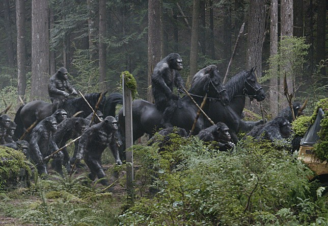 After settling in the forest near San Francisco, Caesar and other apes have been leading a nice tribal life during last 10 years. They made their own primitive community on the top of a mountain, and we see them hunting together with sticks and other tools like our ancestors did a long time ago. I wonder where they acquired those horses which all look like Black Beauty’s descendants from(was there a horse ranch near their area?), but I guess that is a small nod to that memorable moment in “Planet of the Apes”(1968).