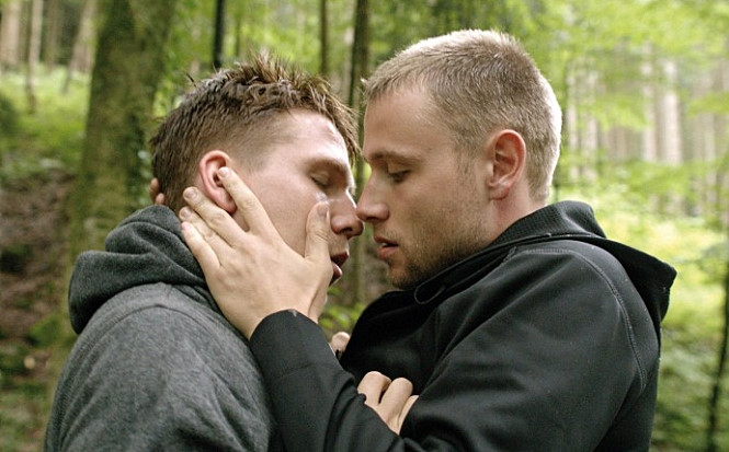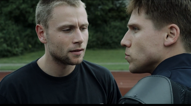 Meanwhile, Marc begins to get close to Kay (Max Riemelt), his roommate at the police academy. They were not that friendly to each other at first, but they get accustomed to each other while spending time together. At one point, they sneak out of their dormitory to enjoy their private time during one night, and we see them jogging together in a nearby forest mainly for improving Marc’s physical strength.