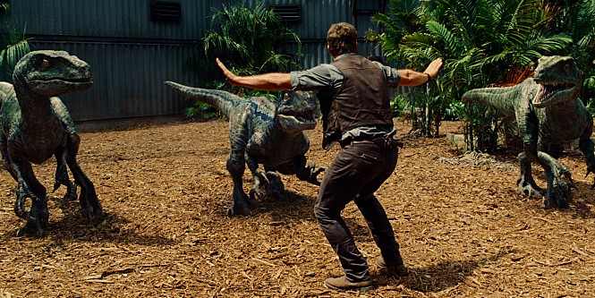 For getting some consultation on the security measures on Indominus rex, Claire Dearing (Bryce Dallas Howard), the supervisor of Jurassic World, goes to Owen Grady (Chris Pratt), a Velociraptor expert who has been trying to train a quartet of Velociraptors for his small project. Being close to those reptiles with big, sharp claws is one of the last things I want to do, but our tough hero shows no qualms about his highly risky work while always being cautious and tactful. He may form a relationship bond between him and his reptiles, but they are still wild, dangerous animals as shown during one tense scene where he must risk his life in front of them. W.G. Sebald once said: “Men and animals regard each other across a gulf of mutual incomprehension.”