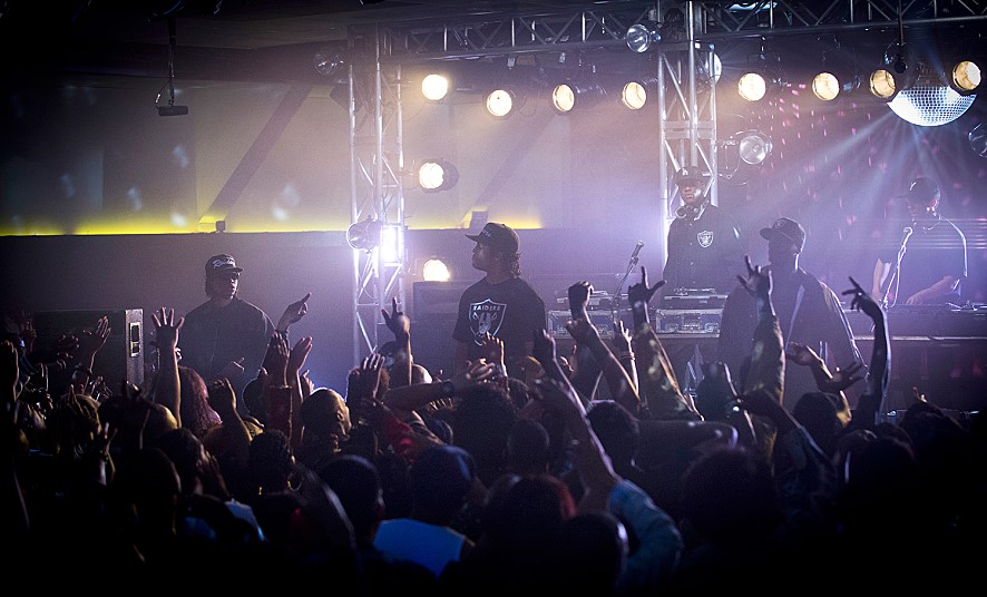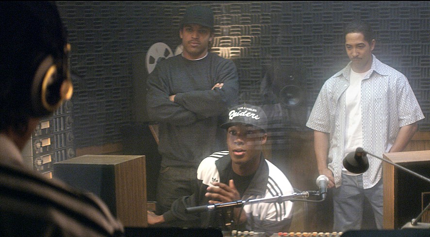 While working as the DJ at a local club owned by Alonzo Williams (Corey Reynolds), Andre “Dr. Dre” Young (Corey Hawkins) considers organizing his own hip hop group, and he persuades his drug dealer friend Eric “Eazy-E” Wright (Jason Mitchell) to finance his personal project while recruiting O’Shea “Ice Cube” Jackson (O’Shea Jackson Jr., who is, yes, Ice Cube’s son), Antoine “DJ Yella” Carraby (Neil Brown, Jr.) and Lorenzo “MC Ren” Patterson (Aldis Hodge). During the production of their first single “Boyz-n-the-Hood”, Eazy-E finds himself wearing more than one hat as coincidentally getting himself placed in the front position, and he and the other group members soon get the first taste of success when their song turns out to be a breakout hit.