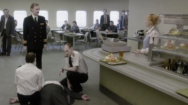 Like Andersson’s two previous films “Songs from the Second Floor” (2000) and “You, the Living” (2007), which are the other two chapters of his trilogy, “A Pigeon Sat on a Branch Reflecting on Existence” is both meticulous and effortless in its handling of moods and details. While the camera usually maintains its static positions, Andersson’s thoughtful scene compositions always attract our attention as we notice something odd and funny on the screen. As an aging captain is having a phone conversation outside a restaurant, we slowly come to spot two particular characters in the restaurant. While the camera focuses on a barber talking directly to the camera and us, we also observe that barber’s only customer sitting near him.
