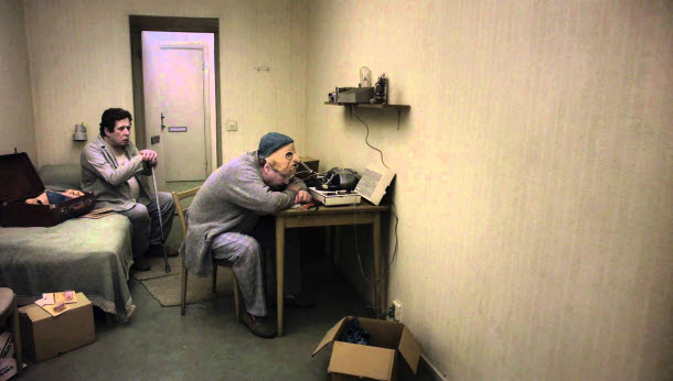Two characters become more prominent as the recurring ones in the film. They are Jonathan (Holger Andersson) and Sam (Nisse Vestblom), and these middle-aged salesmen slouch around the nadir of their shabby business of selling trivial toys for practical joke. They are pretty lousy in dealing with their customers, and they do not get along with each other well either, though they live near each other in the same apartment building. Getting no fun or consolation from each other, they are tired of each other, but then they only find themselves being reminded of how they are destined to be stuck with each other while going nowhere in their miserable daily life. Compared to their seemingly endless predicaments, waiting for Godot looks more cheerful and productive in comparison.