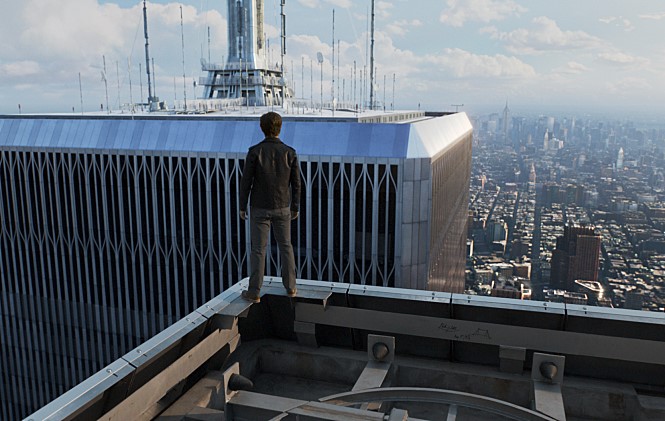 thewalk02The climax sequence in the film is indeed superb with terrifying verisimilitude to both shake and grip us, and Zemeckis and his crew did everything for vividly presenting Petit’s precarious wire walking between the Twin Towers, which are also realistically recreated on the screen with their monumental beauty of around 410 meter (1345 feet). Petit really went back and forth between the Twin Towers more than once – only with a balancing pole. Whenever the camera looks below the wire, some of you may wince or feel dizzy because of the overwhelming sense of height conveyed through the screen. While I cringed a few times as watching this sequence, my mother, who was sitting next to me, was visibly upset as clenching her fists, and she told me later that she could hardly watch it. Only God knows what would have happened if we had watched it in 3D IMAX instead of 2D.
