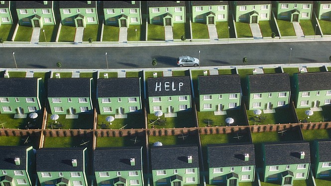 That suburban area in question turns out to be pretty wide and big with many houses, which are totally and uncannily identical to each other in style and structure. I will not deny that, as watching these houses on the screen, my mind was instantly taken back to the lyrics of Malvina Reynolds’s immortal satirical song “Little Boxes”: Little boxes on the hillside / Little boxes made of ticky tacky / Little boxes on the hillside / Little boxes all the same…