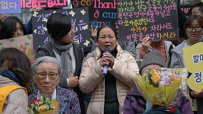 Steadily maintaining its calm position as before, the documentary later shows Nguyễn’s visit to South Korea in 2015. At the South Korean parliament in Seoul, she made a public demand as supported by a local congressman, and she also came to bond with Kim Bok-dong, a prominent human rights activist who had strongly demanded the official apology from the Japanese government for what she and many other ‘comfort women’ suffered during the World War II.