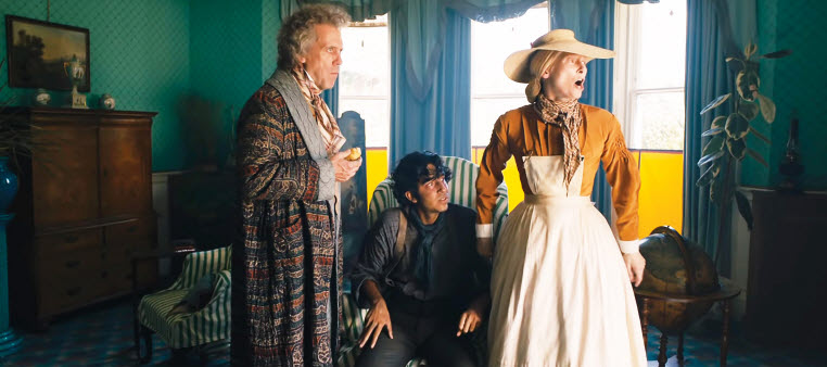 After quickly moving forward to several years later, the movie introduces more characters to swirl around Copperfield, who is now played by Dev Patel from this narrative point. He has stayed in a small and shabby residence along with Mr. Micawber (Peter Capaldi) and his poor family, and some of the most amusing moments in the film come from how Mr. Micawber tries to avoid his latest debt problems as much as he can until he and his family are finally sent to a prison. Not long after that, Copperfield comes to decide that enough is enough, so he walks out of the glass bottle factory and then seeks help from his aunt, who hesitates at first but eventually comes to let him stay in her house. She has lived with Mr. Dick (Hugh Laurie), and Copperfield and Mr. Dick, who is as eccentric as Copperfield’s aunt, later come to have a moment of liberation together as Copperfield helps Mr. Dick dealing with a rather silly matter of obsession.