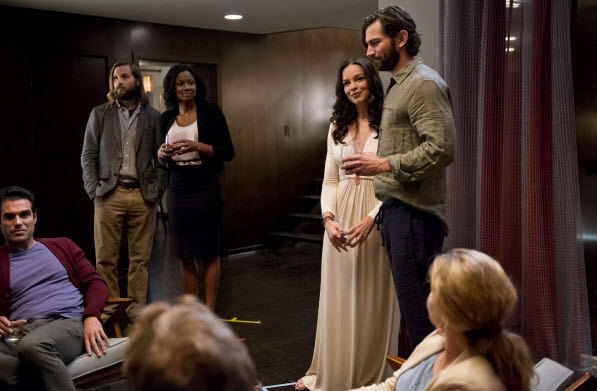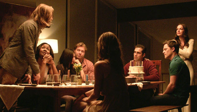 Anyway, Kira and other guests subsequently try to brighten up the mood before the dinner is served, and they find themselves playing a little private game as suggested by Eden and David. All they have to do is simply expressing what they want or wish, but then the mood becomes awkward again when Pruitt suddenly says something quite serious in front of others. Although the camera is simply watching him, John Carroll Lynch, who can be quite amiable as shown from “Fargo” (1996) but also can be very sinister as demonstrated in “Zodiac” (2007), firmly holds our attention during that moment, and we accordingly become quite unnerved just like others around him on the screen.