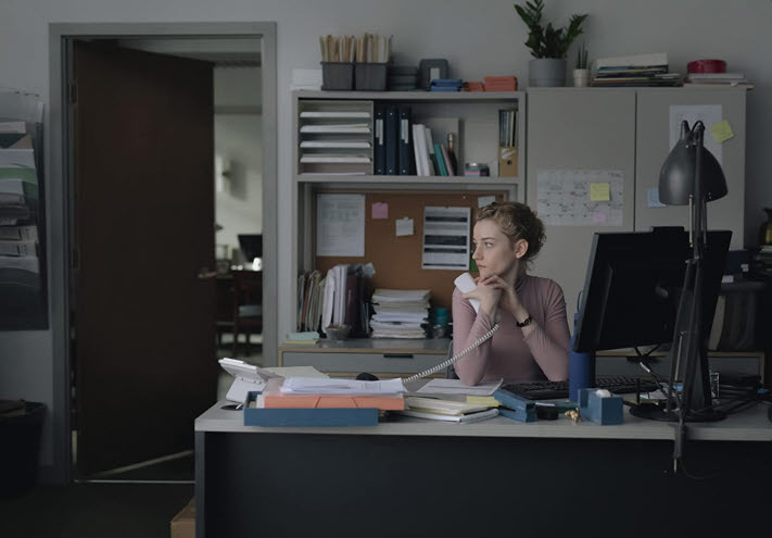 Constantly emphasizing the drab and moody ambiance of her work environment, the cinematography by Michael Latham effectively conveys to us the growing sense of isolation and suffocation around Jane. Although many different people come and go around her (You may be amused a bit by the unexpected cameo appearance of a certain famous movie actor, by the way), she is usually alone by herself, and she keeps being burdened with more things to be handled immediately for her boss, who is seldom shown on the screen even when he is in his office.