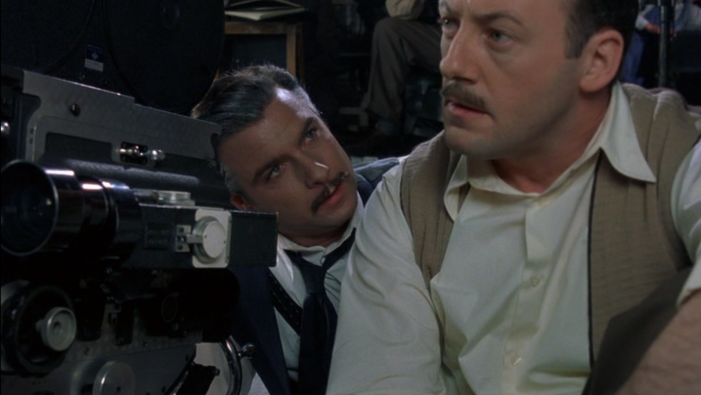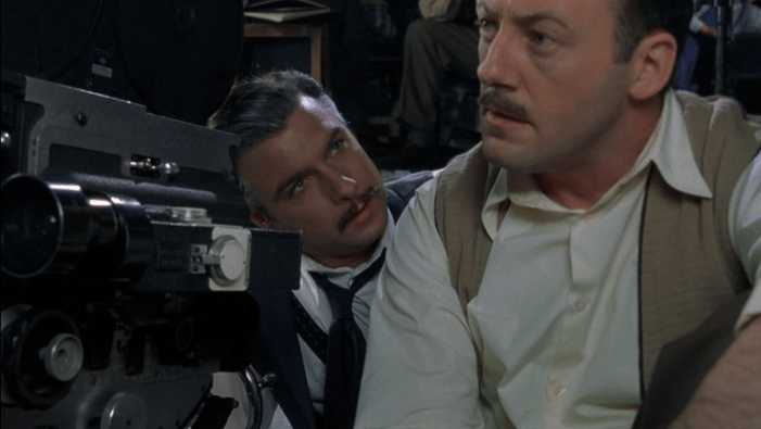 What follows after that is a rather brief but exhilarating part giving us a closer look into the production of “Citizen Kane”. We see Welles thoroughly studying and analyzing John Ford’s “Stagecoach” (1939) along with his cinematographer Gregg Toland (Liam Cunningham), and then the movie serves us a series of amusing moments on the set including the scene where Welles and Toland go all the way for getting an extreme low-angle shot exactly envisioned by Welles. Because of that and many other incidents on the set, Schaefer and RKO executives have constant headaches everyday, but they have no choice but to keep tolerating Welles as legally bound to their contract with him.