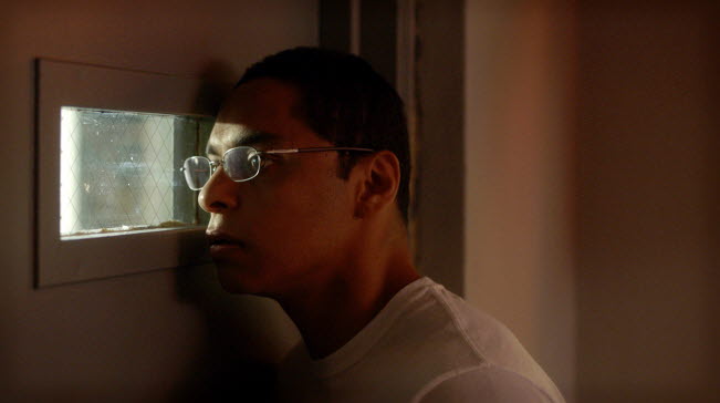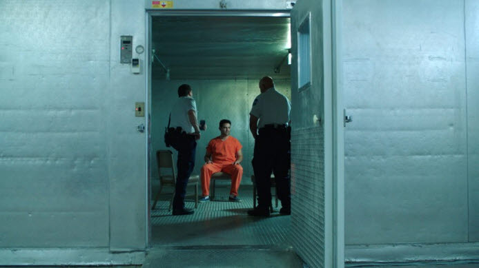 Around that point, directors/co-producers/co-writers Cristina Ibarra and Alex Rivera begin to alternate between reality and fiction. We see Marco preparing for his infiltration with his fellow activists, and then we get a fictional scene based on the recording of a conversation between him and a Border Patrol officer who was about to arrest him. Now played by Maynor Alvarado from this point, Marco begins to work on his mission step by step once he is sent to the Broward Transitional Center, and he soon encounters Claudio and then informs Claudio on what he is going to do.