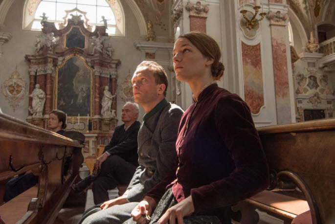 Full of calm pastoral mood all over the screen, the early part of the film phlegmatically depicts the daily life of Jägerstätter and his wife Franziska (Valerie Pachner) in their mountain village St. Radegund around the late 1930s. Although it seems that the war has already begun, things are still quiet and peaceful in the village while they and other village residents work and live as usual, and we also get a series of glimpses into their happy married life with their young daughters. Although it is implied that there was a time when he was young and wild, Jägerstätter has been a benign dude with deep religious devotion probably because of his wife’s warm and gentle influence on him, and we sometimes see him doing some maintenance jobs on a local Catholic church for free.