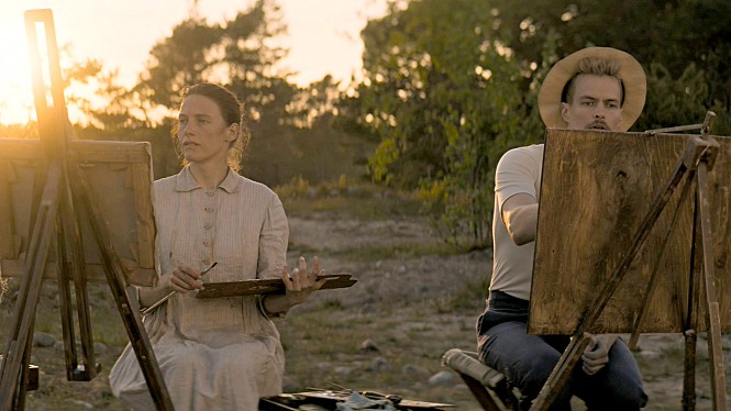 Meanwhile, Reuter begins to approach closer to Schjerfbeck as admiring more of her works, and she does not mind that at all despite the considerable age gap between her and this handsome lad. When she tries to adjust the light setting on her paintings because it does not feel light to her, he gladly gives her some help, and that leads to more relationship development between them. After she invites him to her residence for sharing her artistic process with him, he suggests that they should have a vacation together on a beach, and everything looks fine and well to her when they enjoy a little private moment together.