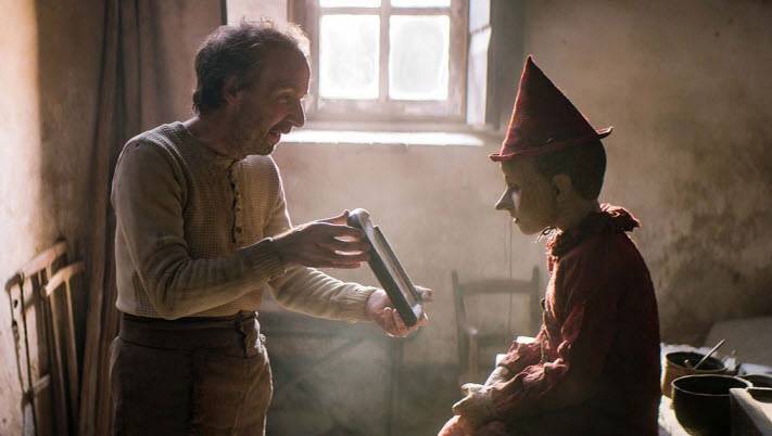 In the beginning, we see how its young eponymous hero is created by an old carpenter named Geppetto (Roberto Benigni, who dials down his rambunctious comic persona a bit here in this film). While he is going through another mundane life of his shabby daily life, Geppetto happens to encounter a puppet theater troupe, and, after getting a glimpse on those puppets, he promptly decides to make a puppet for himself. Fortunately, a piece of wood which seems to be imbued with some magic comes handy to him, and we soon see him diligently carving that piece of wood into a little human figure.