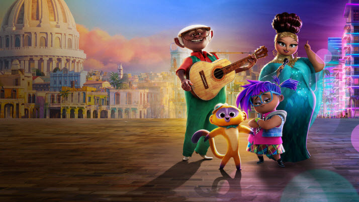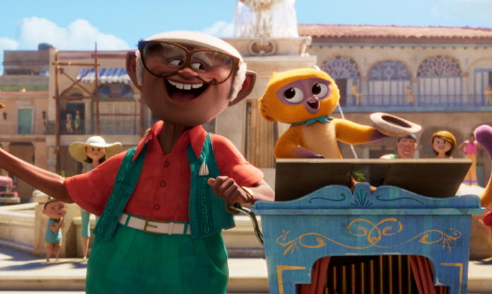 The opening part of the film, which is set in Havana, Cuba, is engaging thanks to an odd but interesting pairing of two different talented artists. While Lin-Manuel Miranda, who has been a big household name to many of us thanks to his Broadway mega hit “Hamilton”, is jolly in his spirited voice performance as a kinkajou named Vivo, Juan de Marcos González, a Cuban musician who has been a key member of the Buena Vista Social club, effortlessly brings warmth and wisdom to Vivo’s old, hearty musician owner Andrés, and their distinctive voice actings complement well each other when they perform the first musical number scene in the film together.