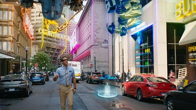 At the beginning, the movie sets up its artificial main background through the cheery viewpoint of its nice ordinary hero. For Guy (Ryan Reynolds), everyday feels pretty much same as he wakes up and then goes to his mundane workplace, but he has no problem with that at all, and the same thing can be said about everyone else in the city including his best friend Buddy (Lil Rel Howery). No matter how frequently their city is smashed by certain figures everyday, they are not so shocked at all while following their respective routines as usual, and the movie generates some laughs from this absurd comic setting.