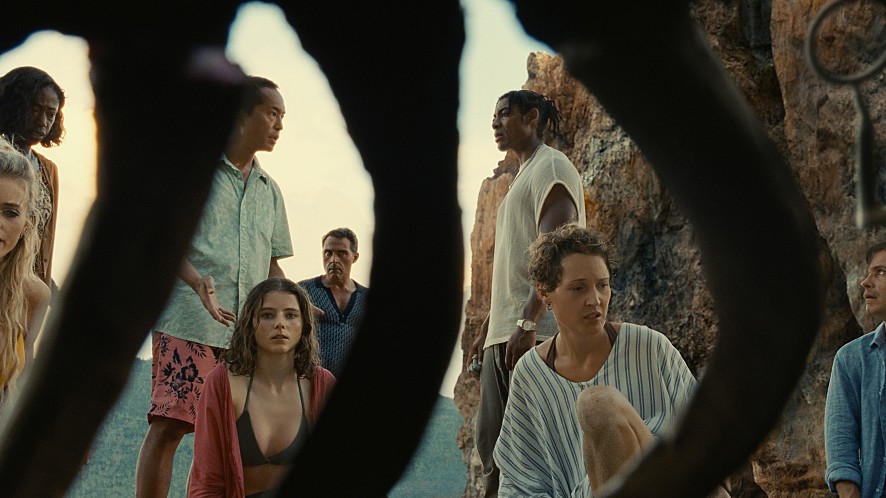 As gradually pushing its main characters into more dread and desperation along the plot, the movie, which is based on Pierre Oscar Levy and Frederik Peeters’ graphic novel “Sandcastle”, doles out one unnerving moment to another. As they get aged second by second, Guy, Prisca, and other adult characters on the beach are more reminded of their physical fragility, and Prisca soon comes to have a very gruesome emergency when her certain illness becomes quite more serious than before. In case of Guy and Prisca’s two kids, they are naturally aghast at how suddenly they grow up so fast within a few hours just like some other kid on the beach, and we are served with a morbidly intense scene when one of them happens to have a serious biological problem with that other kid due to their lack of certain physical knowledge.