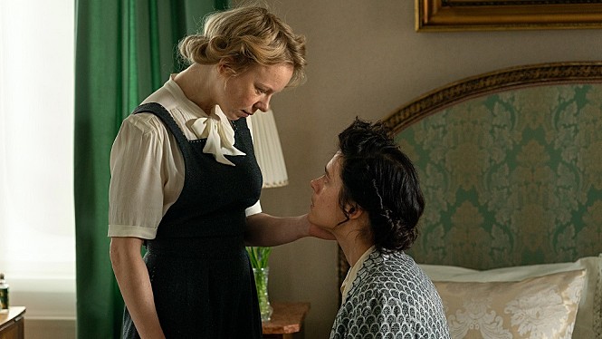 Around that time, Jansson becomes romantically involved with a journalist/politician named Atos Wirtanen (Shanti Roney). Although Wirtanen is married at present, both Jansson and Wirtanen do not care about that at all while having no illusion about whatever will happen between them next, and Wirtanen later gives Jansson a small but interesting opportunity. His newspaper happens to need a cartoonist who can provide some amusement for children, and Jansson looks like the right person for that, because she has occasionally drawn amusing caricatures including the one satirizing the grim current situation of Adolf Hitler and his Nazi Germany.