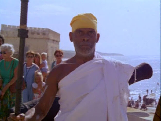 The opening part of the film, which is unfolded at Cape Coast Castle in Ghana, may be a bit too symbolic, but it is striking enough to hold our attention. We see an old guy chanting and beating a drum for a while, and then this curious moment is followed by a young African American model having a photography session along with a Caucasian photographer. As these two figures freely do there work here and there around the castle, we hear a bit about the history background of the castle from a tour guide leading a bunch of tourists, and then the model happens to be confronted by that old dude, who firmly demands to her that she should look back into the past of her ancestors.