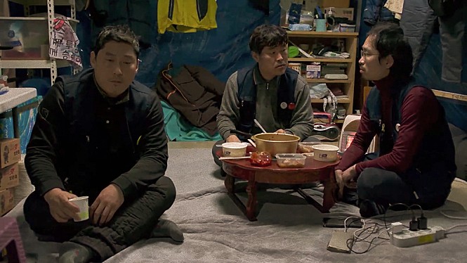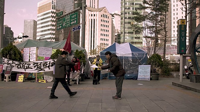 Of course, it turns out to be quite difficult for Jae-bok to find any suitable job for his current situation. Although he surely has considerable skill and experience to say the least, his unemployed status during next five years naturally sticks out in his résumé, and there is a little painfully awkward moment when an employment agency guy asks him a bit more about what he has been doing during that period. He could tell the truth, but his status as a protesting labor union member is certainly not something to help him get a job.