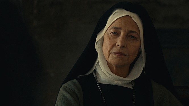 At the beginning, the movie, which is set in the 17th century Italy, shows us the early life of a nun named Benedetta Carlini (Virginie Efira). When she was very young, her rich merchant father sent her to the abbey of a content in a small town of Tuscany, and we get a moment of sardonic black humor as her father and the Abbess, played by Charlotte Rampling, come to have some conflict on how much he has to pay for her daughter being accepted into the abbey. No matter how much he tries to persuade her, the Abbess remains unflappably no-nonsense as before, and Benedetta’s father eventually agrees to accept her conditions.