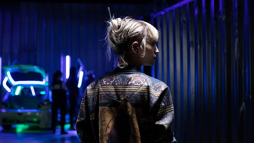 Several years later, Alexia (Agathe Rousselle) is a young woman now, and cinematographer Ruben Impens’ camera smoothly follows after her as she enters a motor show featuring many showgirls making erotic movements in front of fancy vehicles. She also works there as a showgirl, and she does not disappoint those male audiences at all when she does her work on one of the vehicles.