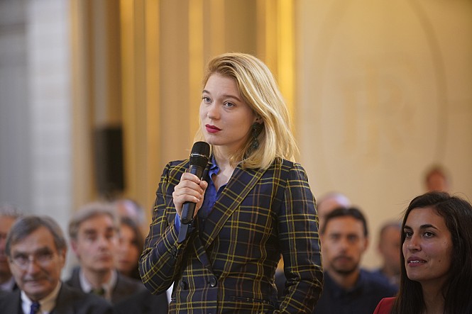 Léa Seydoux, who has been one of the most interesting French actresses since she drew our attention for the first time via her supporting turn in “Mission: Impossible – Ghost Protocol” (2011), plays France de Meurs, a TV reporter who has been quite famous for years thanks to her popular TV news show. At the beginning, we see her entering a very important press conference along with her close friend/colleague Lou (Blanche Gardin), and the movie gives us a little amusing moment as she boldly throws a supposedly important question to the current president of France, whose archival footage is seamlessly incorporated into this scene.