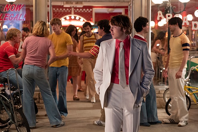 Set in the San Fernando Valley area of the LA county, California in 1973, the movie opens with an offbeat variation of Meet Cute moment between its two main characters. When he is preparing for his high school picture day along with his schoolmates, Gary Valentine (Cooper Hoffman) comes across a young woman working as the photographer’s assistant, and he is instantly smitten by this lass even though she is 25 while he is only 15. Although she is just mildly amused by his innocent approach at first, Alana Kane (Alana Haim) subsequently lets herself getting involved more with him, and that is the beginning of their unusual relationship.
