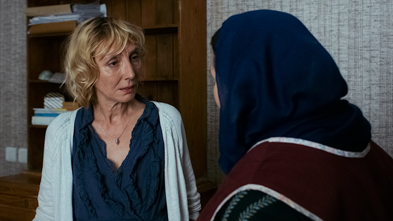 Khan also draws the very good performances from his three main cast members. Joanna Scanlan, who deservedly received the BAFTA Best Actress award for this movie a few weeks ago, steadily anchors the film with her many quiet but emotionally palpable moments in the movie, and her excellent acting shines whenever she lets us sense more of her character’s life story. On the opposite, Nathalie Richard, a veteran French actress who has appeared in a number of various French films ranging from Olivier Assayas’ “Irma Vep” (1996) to Michael Haneke’s “Caché” (2005), effectively complements her co-star on the whole, and Talid Ariss holds his own small place well between Scanlan and Richard as another substantial part of the story.