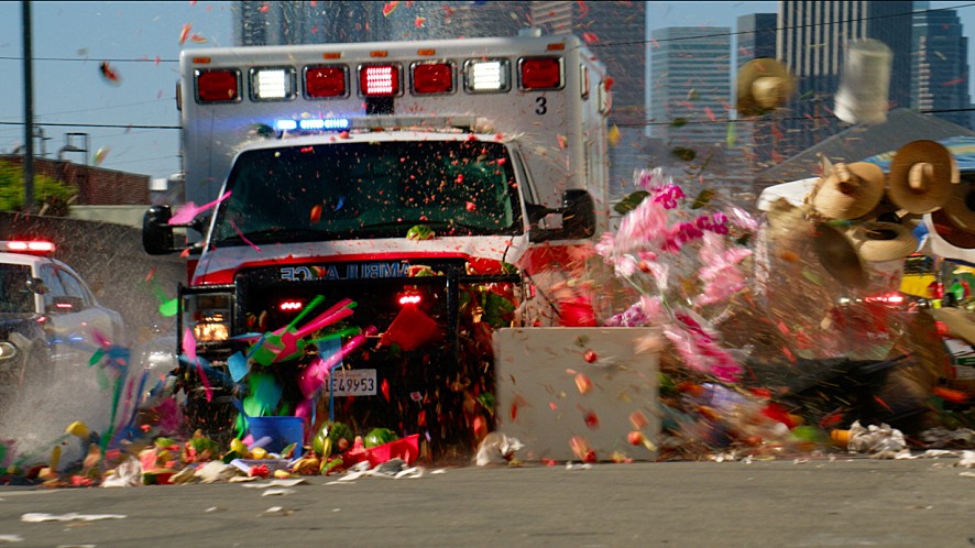 Once its several main characters are introduced and then established, the movie serves us one vehicle chase sequence after another as Danny and Will frantically drive the ambulance here and there around the city. We surely behold lots of vehicles smashed or overturned on the screen, and I must confess that I was a bit amused by a brief moment which can be regarded as an equivalent to a certain movie cliché involved with fruit carts.