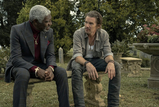 However, not so surprisingly, Raymond and Ray do not get along that well with each other from the beginning. While both of them surely feel hurt as remembering those good and bad moments involved with their father, they often argue with each other during their journey to their father’s funeral, and McGregor and Hawke did a good job of embodying their respective characters’ damaged souls. Here are two man who were hurt and broken in one way or another in their shared past, and Hawke and McGregor ably establish not only their characters but also the long history between them.
