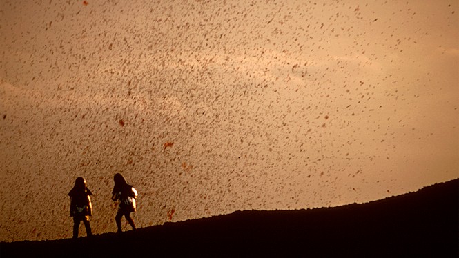Although they initially thought that it was not right to categorize volcanoes due to their various characteristics, Katia and Maurice eventually agreed that volcanoes could be divided into two categories. In case of “red volcanoes”, they are relatively less dangerous because their craters simply spew up red hot lava to be flowed down from them, and that was how Katia and Maurice could often closely capture those vivid moments of eruption from this kind of volcanoes. At one point, the documentary shows an archival footage clip showing hot lava quickly cooled by sea water, and that is certainly another marvelous moment to watch.