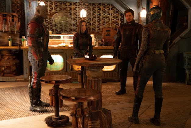 Because I did not watch that Holiday special TV movie, it took some time for me to get used to how things have been changed for Peter Quill / Star-Lord (Chris Pratt) and his fellow members of Guardians of the Galaxy. They come to settle in a place called Nowhere for building their little headquarters, and we also get to know a bit about two new members Kraglin / On-Set Rocket (Sean Gun) and a telekinetic dog named Cosmo (voiced by Maria Bakalova).