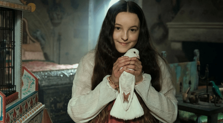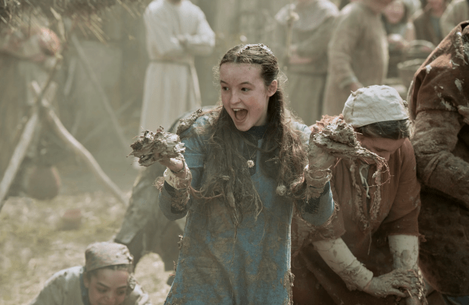 Mainly set in some rural feudal territory in England around the 13th century, the movie quickly establishes a little comfortable world surrounding Lady Catherine (Bella Ramsey), a 14-year-old noblewoman who has enjoyed her life and freedom as much as possible as your average plucky girl. At the beginning, we see her engaged in a big mud fight along with other kids in the area, and she does not mind at all about getting quite muddy just like others.