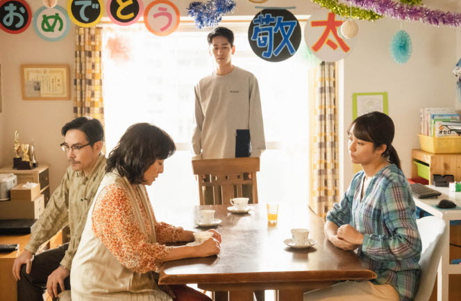 At first, the movie seems to be about a little family conflict. As Taeko (Fumino Kimura) and her second husband Jiro (Kento Nagayama) are preparing for a little private party for not only a little recent achievement of Taeko’s young son but also the 65th birthday of Jiro’s father, everything seems to be going well on the surface, but then we come to learn that Jiro’s father does not approve much of his son’s recent marriage just because Taeko was an divorcée with the son from the previous marriage when Jiro married her several years ago. While he has been like a real dad for Taeko’s son, Jiro still wants his father to show some recognition on his current married life at least, and this conflict between them causes a very awkward moment among them and others at one point, though it is quickly resolved mainly thanks to Jiro’s no-nonsense mother.
