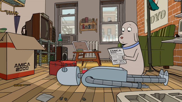 And then Dog happens to pay attention to a TV commercial advertising a new brand of robot as a possible companion. Without any hesitation, Dog, who seems to be male as far as I observe from the film, picks up the phone for ordering it, and his ordered robot is soon delivered, though he needs a lot of time for assembling its many different parts together just like we usually need many hours for assembling those IKEA products.