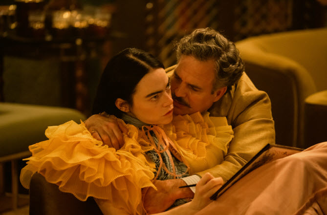 The other main cast members surrounding Stone dutifully support her baroque lead performance. While Mark Ruffalo received an Oscar nomination for his dynamically comic supporting turn, Willem Dafoe, who is no stranger to playing weird and grotesque roles at all, deftly balances his character between horror and comedy, and Ramy Youssef is effective in his low-key acting as the most sensible person in the story. Christopher Abbott and Jerrod Carmichael, who incidentally appeared together in Carmichael’s debut feature film “On the Count of Three” (2021), add extra dark cynicism to the film during their respective brief appearances, and Kathryn Hunter, Hanna Schygulla, Vicki Pepperdine, Suzy Bemba, and Margaret Qualley hold each own small place well as the substantial female supporting characters in the story.