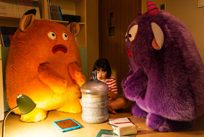 It is no surprise that Dong-choon sometimes enters her little fantasy world which looks sunny and cheerful with a couple of colorful imaginary figures. These figures look pretty much like those silly figures you will encounter via many TV shows for young children out there, but they seem quite real to Dong-choon nonetheless because she has no real friend around her. In fact, they often provide her some sensible support and guidance her parents cannot give, and this certainly means a lot to her.